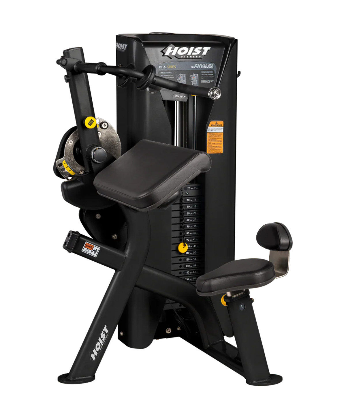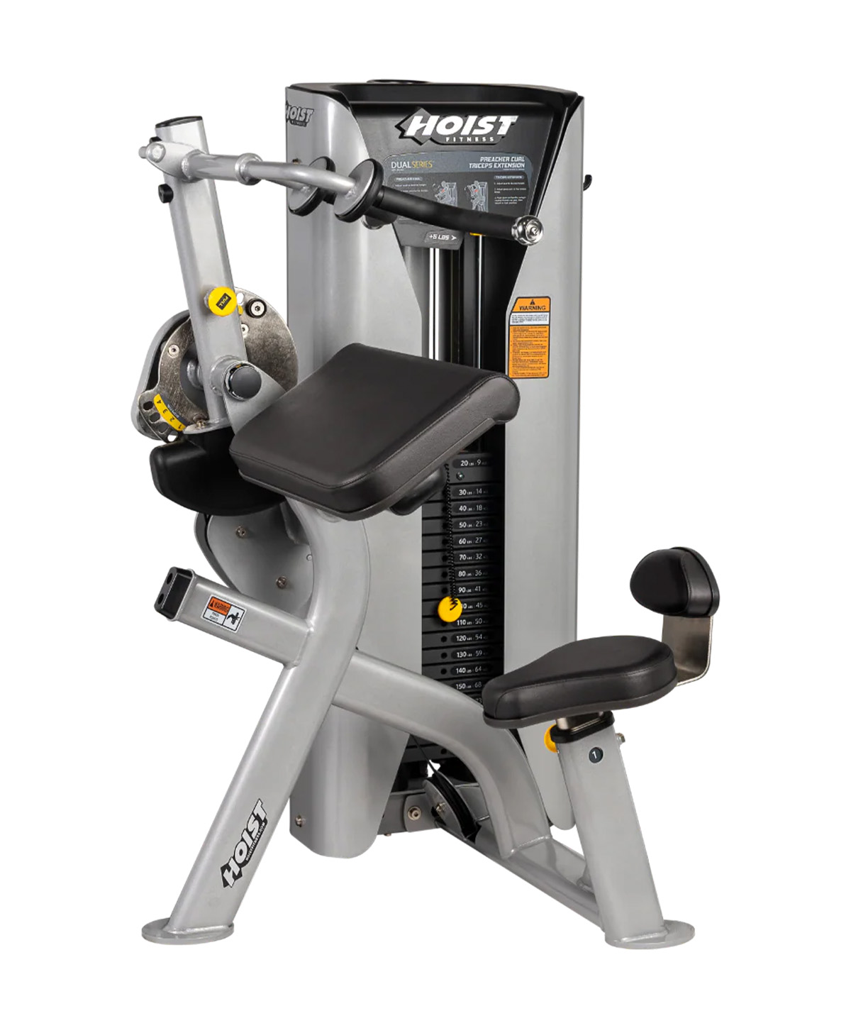 HOIST® Preacher 弯举/肱三头肌伸展器配备双向手臂和多种活动范围调节功能,使得二头肌和三头肌的训练都能在一台机器中完成。该机还标配多种握把选项和七座调节,以适应不同用户身高。
